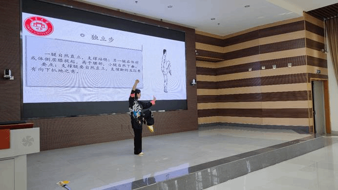 讲座中,王继娜老师从太极拳/剑的起源发展、基本技术方法和太极剑套路三个方面向同学们分享了太极剑的相关知识。她在讲解太极剑的过程中,首先向同学们演示了太极剑手形与步形,接着又执剑介绍了太极剑的刺剑、点剑和劈剑等基本剑法,并深刻解析了太极剑各段的动作要点。最后融合音乐,向同学们展示了一套完整的太极剑动作。王继娜老师的动作行云流水,连绵不断,充分体现出太极剑的技法和风格特点。