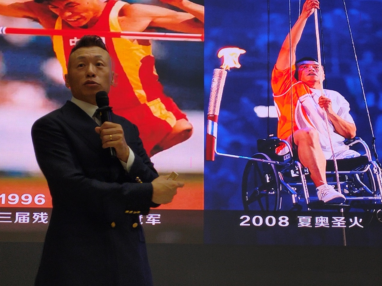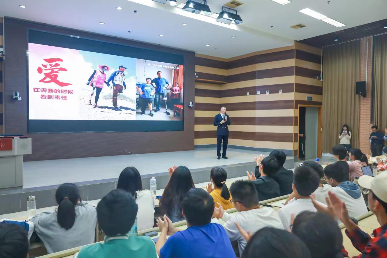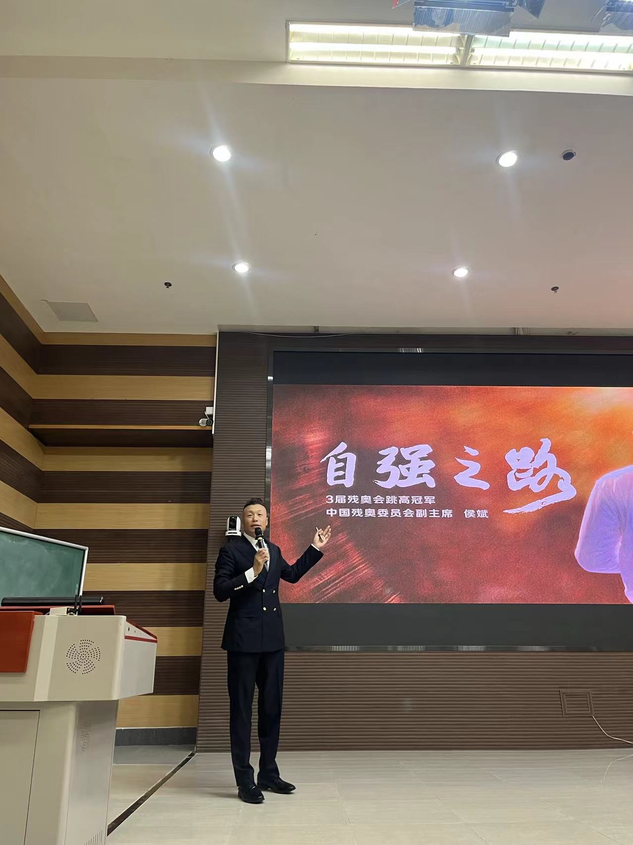 李雪处长以一段VCR带大家认识了这位响当当的残奥会世界冠军——侯斌老师,点燃了全场的气氛。在热烈的掌声下,侯斌老师闪亮登场,并亲切的让大家称呼他为“侯哥”。侯斌老师讲述了自己从九岁失去左腿,到成为一名残奥会世界冠军的非凡经历,分享了自己破世界记录的心路历程,鼓励同学们“人生有无限可能,面对困难要找内因,从改变自己开始”“你的目标决定了你的高度”等等。冠军并非一开始就站在巅峰,谈及成为2008年残奥会主火炬手的经历,侯斌老师坦言自己一开始也只是个替补,是坚持、相信、热爱、努力的力量,让他不断地向上攀升,最终亲手点燃圣火。离开运动赛场后,奥运精神没有消退,仍在他身上闪烁,他坚持考大学,参加戈壁挑战赛,身上始终保持一股不服输的劲。临近尾声,侯斌老师动情地说到“人生上半场靠坚持和毅力,下半场靠感恩和爱”,热心公益的他尽己所能让更多人从身体到精神上重新站立起来。