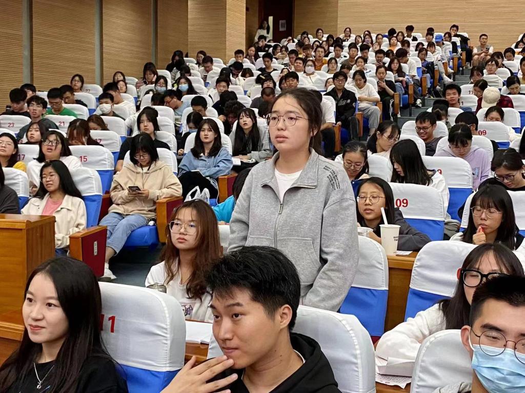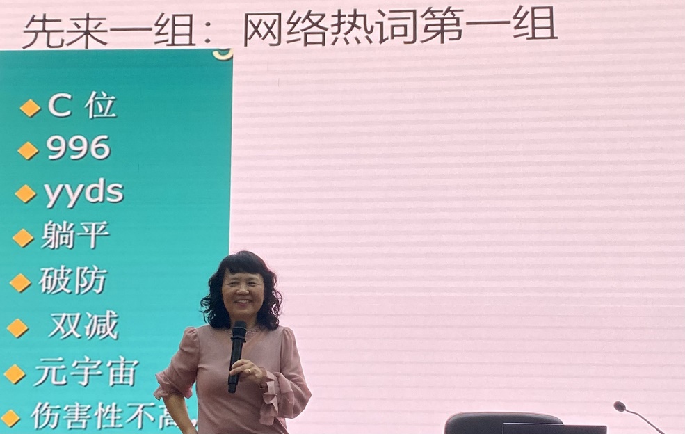 黄锐教授以最近的热点话题——世界杯切入,分享外国友人的相关讨论,激发同学们英语学习的兴趣。随后介绍了我校英语教学的具体内容以及我校英语精品在线课程、公众号等众多英语学习平台,鼓励同学们通过多样化的学习渠道提升自我学习效率。黄教授通过与同学们讨论“C位”、“yyds”、“emo”、“麻了”、“裂开”等网络热词以及生活标识使用英语不当等生动例子,引导同学们在轻松有趣的氛围中思考应怎样用英语表达中式想法、怎样准确进行中英互译,并对多个成语、俗语进行现场举例。有多位同学与黄教授进行现场交流并获得了黄教授的赠书。在讲座的结尾,黄锐教授给大家分享了自己父母坚持每日学习的视频,告诉同学们学无止境,“It's never too old to learn”。